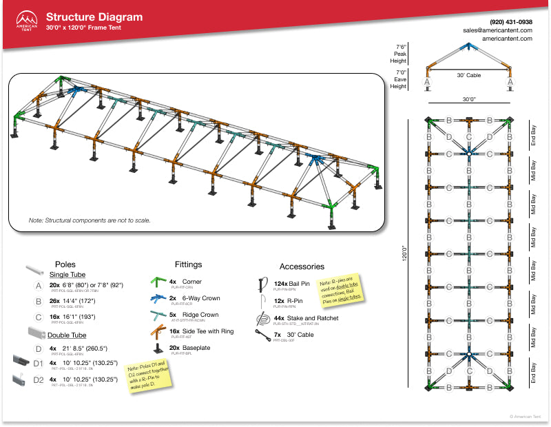 The 30x120 ft American Tent frame tent is a larger-scale tent with a simple setup that doesn’t require complicated staking, central beams, or setup tools. We recommend a setup team, which will allow for a quick setup and teardown. If you don’t have a large setup team, McVey frame jacks are just the thing to make setup easier. Always use a drop cloth when unrolling your tent top to prevent scratching, stains, pinholes, and more, always call 8-1-1 before staking anything.