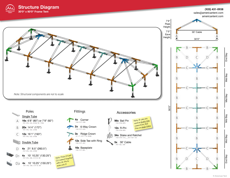 The 30x90 ft American Tent frame tent is a larger-scale tent with a simple setup that doesn’t require complicated staking, central beams, or setup tools. We recommend a setup team, which will allow for a quick setup and teardown. If you don’t have a large setup team, McVey frame jacks are just the thing to make setup easier. Always use a drop cloth when unrolling your tent top to prevent scratching, stains, pinholes, and more, always call 8-1-1 before staking anything.